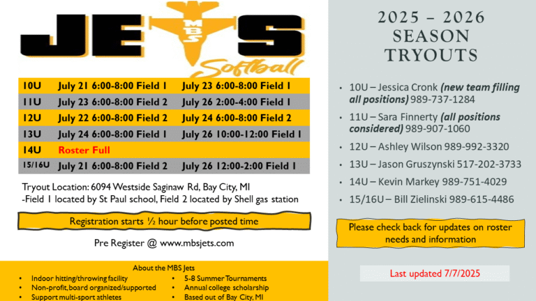 The MBS Jets is non-profit membership organization with an IRS 501 (c) (3) designation, consisting of girls interested in the sport of girls fastpitch softball. The club was organized to promote a positive environment for the girls to improve their softball skills while enabling personal growth. The MBS Jets stress family involvement, academics, skill improvement and sportsmanship by the girls and their families. Most of the families that makeup our organization are residents in Bay, Saginaw and Midland counties with several families in outlaying areas. There are currently 8 teams’ ages 10U – 18U.